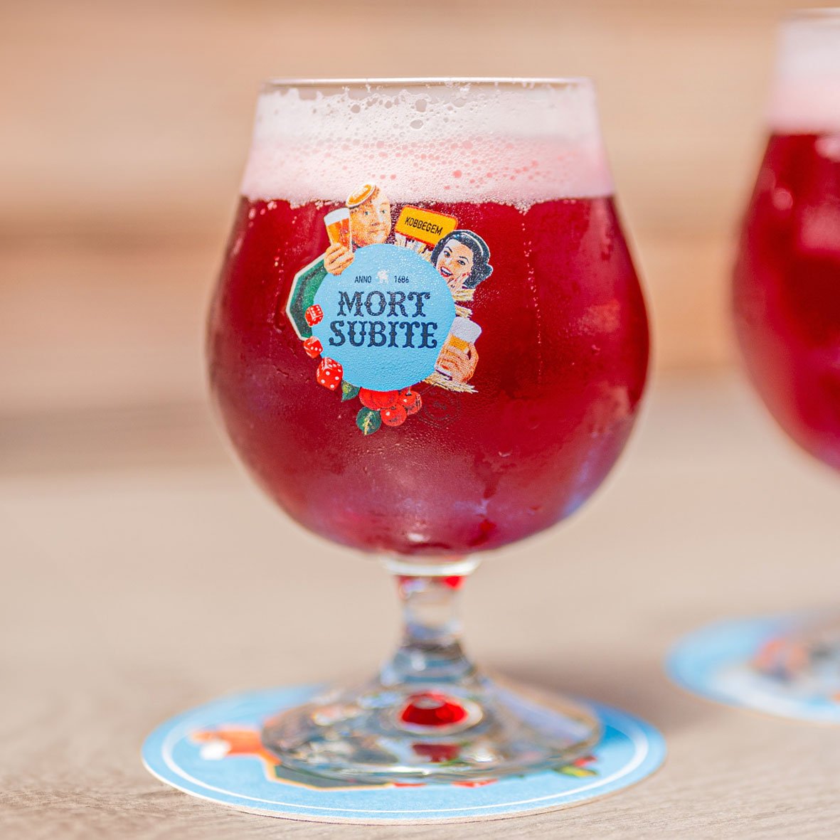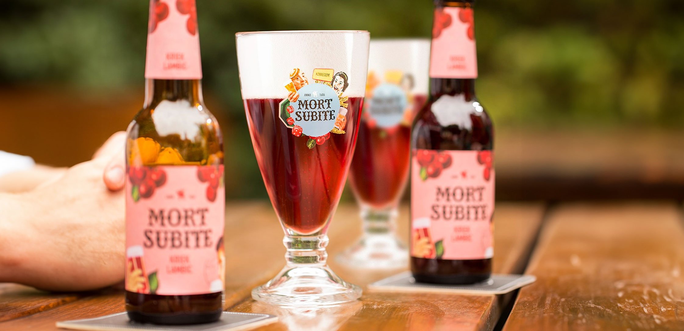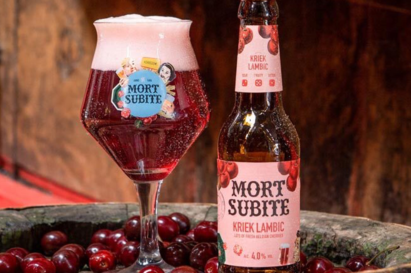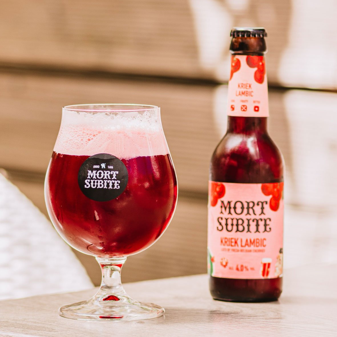My name, Mort Subite, means “Sudden Death” — a nod to the thrilling dice game once played in a lively Brussels café where the final throw could change your fortune in an instant. That very café, founded in 1928 by Théophile Vossen, lives on in spirit through me — a cherry bombshell born from wild fermentation and Belgian mischief, brewed in the heart of the Zenne Valley since 1686.