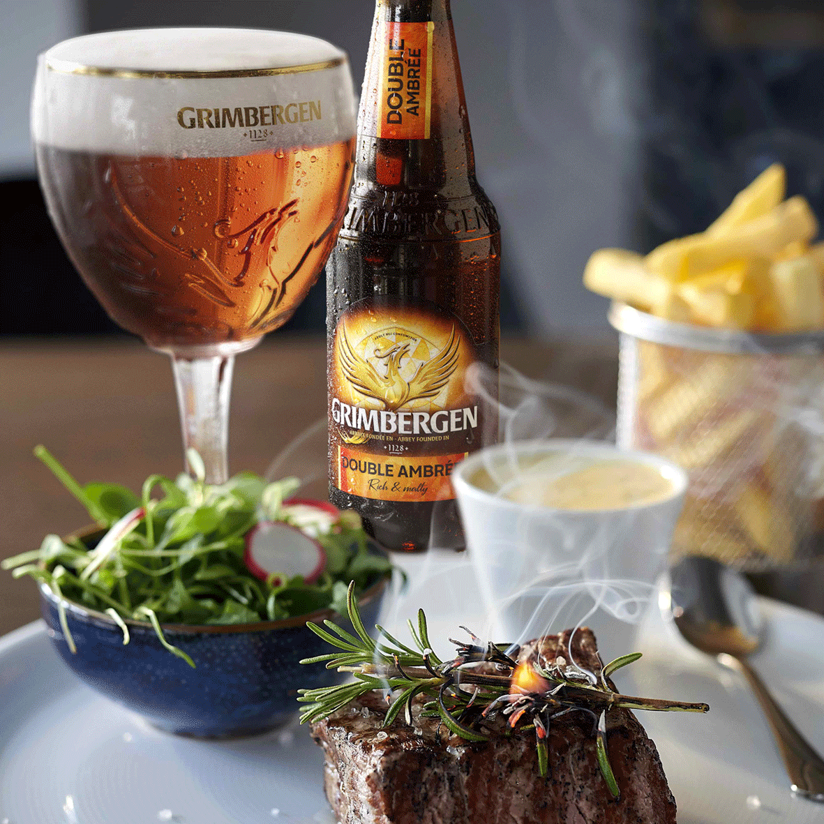 I was forged in fire and tempered in time — the darker, deeper side of Grimbergen’s eternal flame. I’m the Double Ambrée, a Dubbel-style ale born of roasted malts, slow caramelisation, and centuries of monastic mastery. My amber hue glows like stained glass catching the last light of evening vespers, hinting at the richness that awaits within.